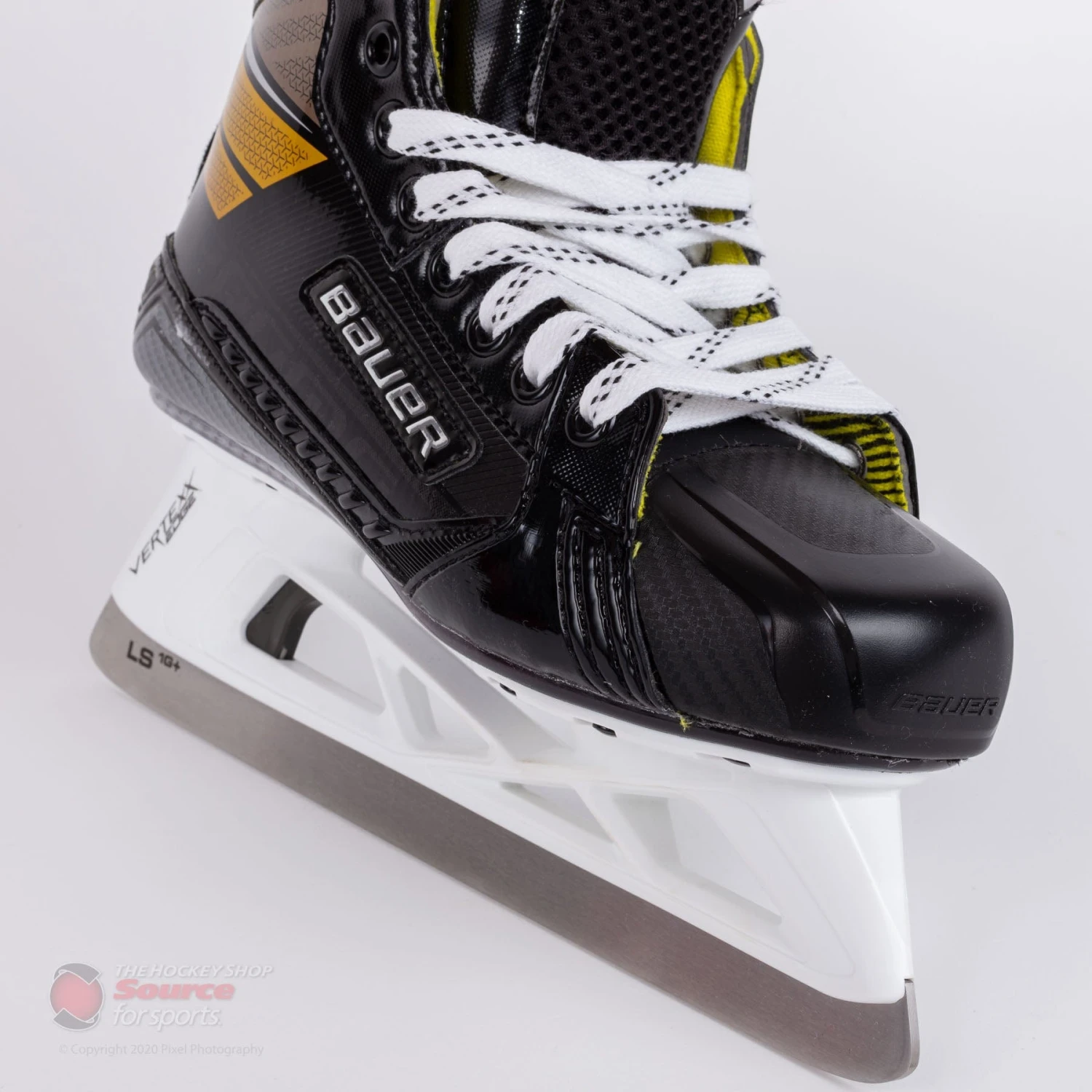 The Bauer Supreme 3S Goal Skates feature a black composite quarter with a double yellow stripe along with bright silver accents. A gloss black Supreme outlined logo runs the length of the skate while a silver and gold 3S logo sits on the back of the ankle combined with a gold supreme logo on the top of the heel giving the new 3S skates a sharp look that stands out.